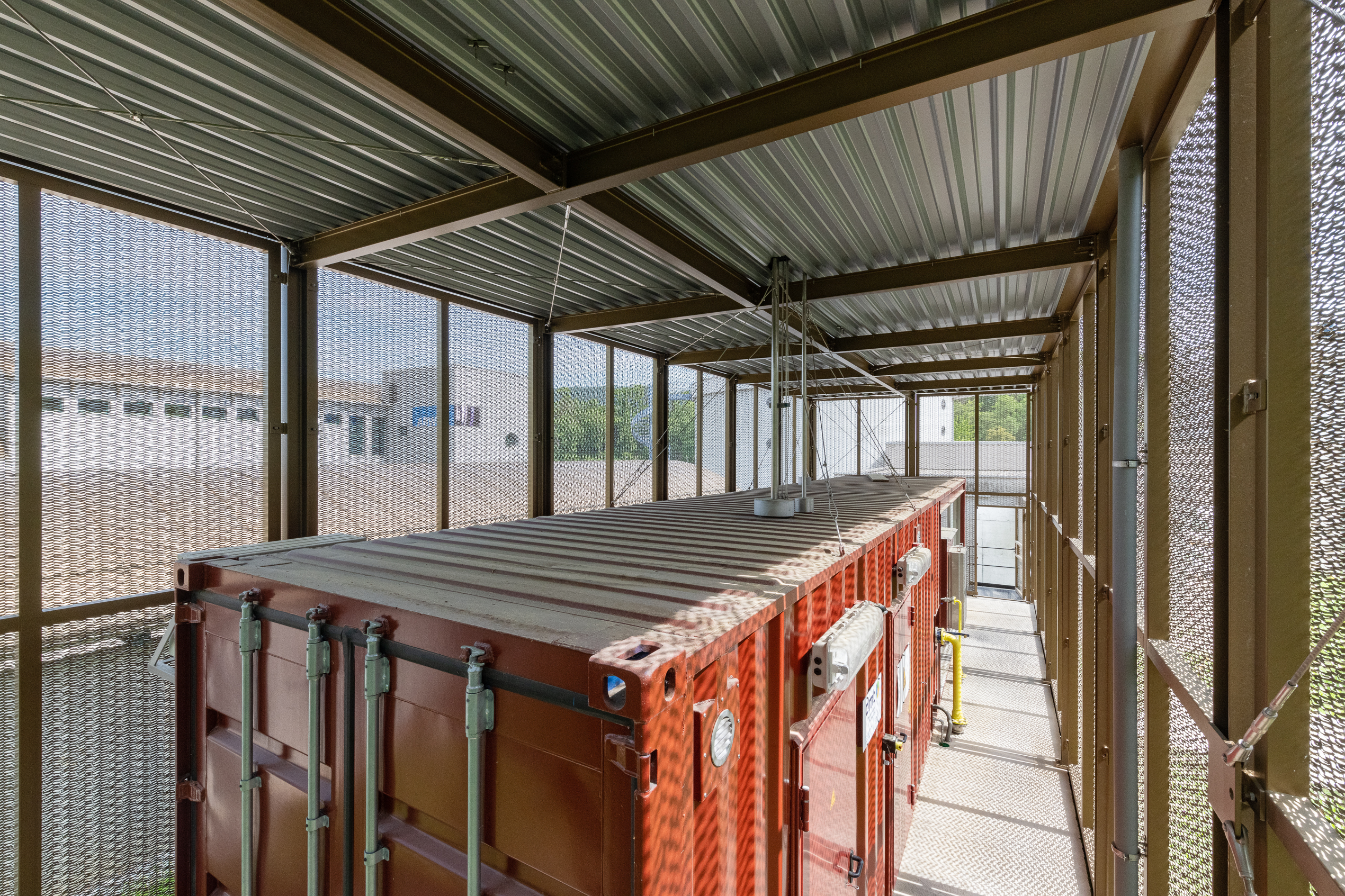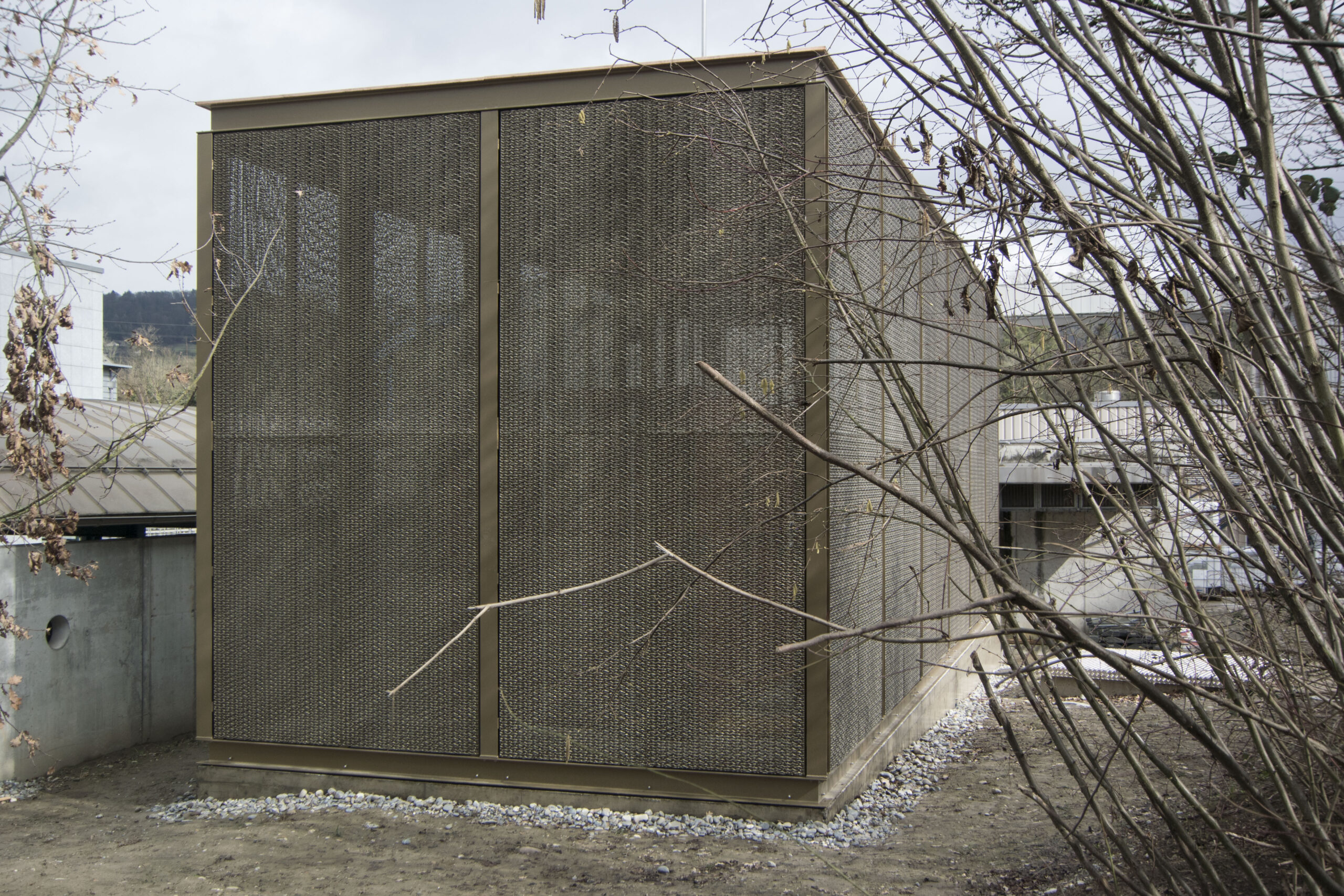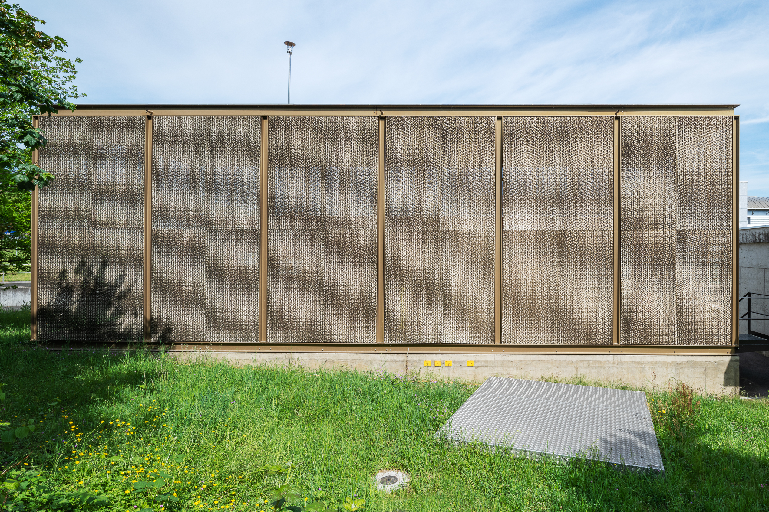 Für die Biogas-Aufbereitungsanlage in Turgi haben wir den Stahlbau mit einer Streckmetallfassade geplant. In dieser Anlage wird das Gas, das während der Abwasserreinigung entsteht, so aufbereitet, dass es dem Erdgasnetz der Regionalwerke hinzugefügt werden kann. Der Container der Anlage ist mit einer luftdurchlässigen Hülle versehen, die ihn vor Witterungseinflüssen schützt. Die Materialwahl spiegelt sowohl die fortschrittliche Technologie der Anlage als auch das industrielle Umfeld wider.