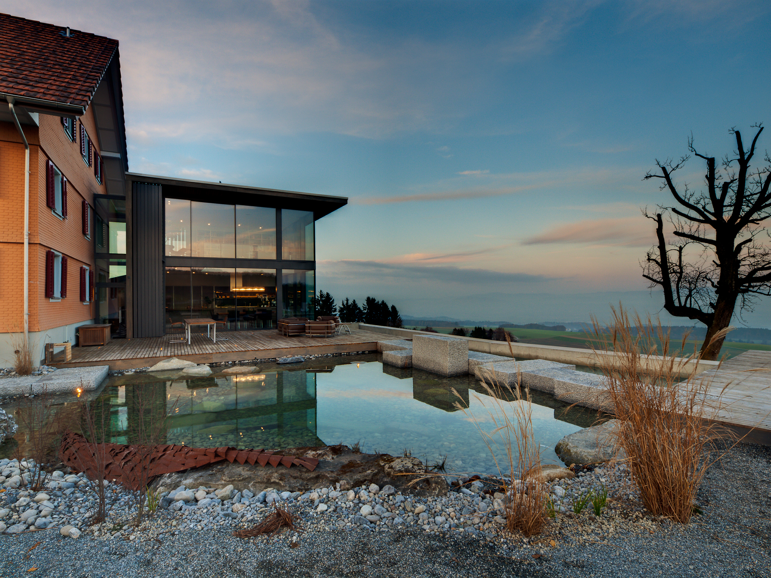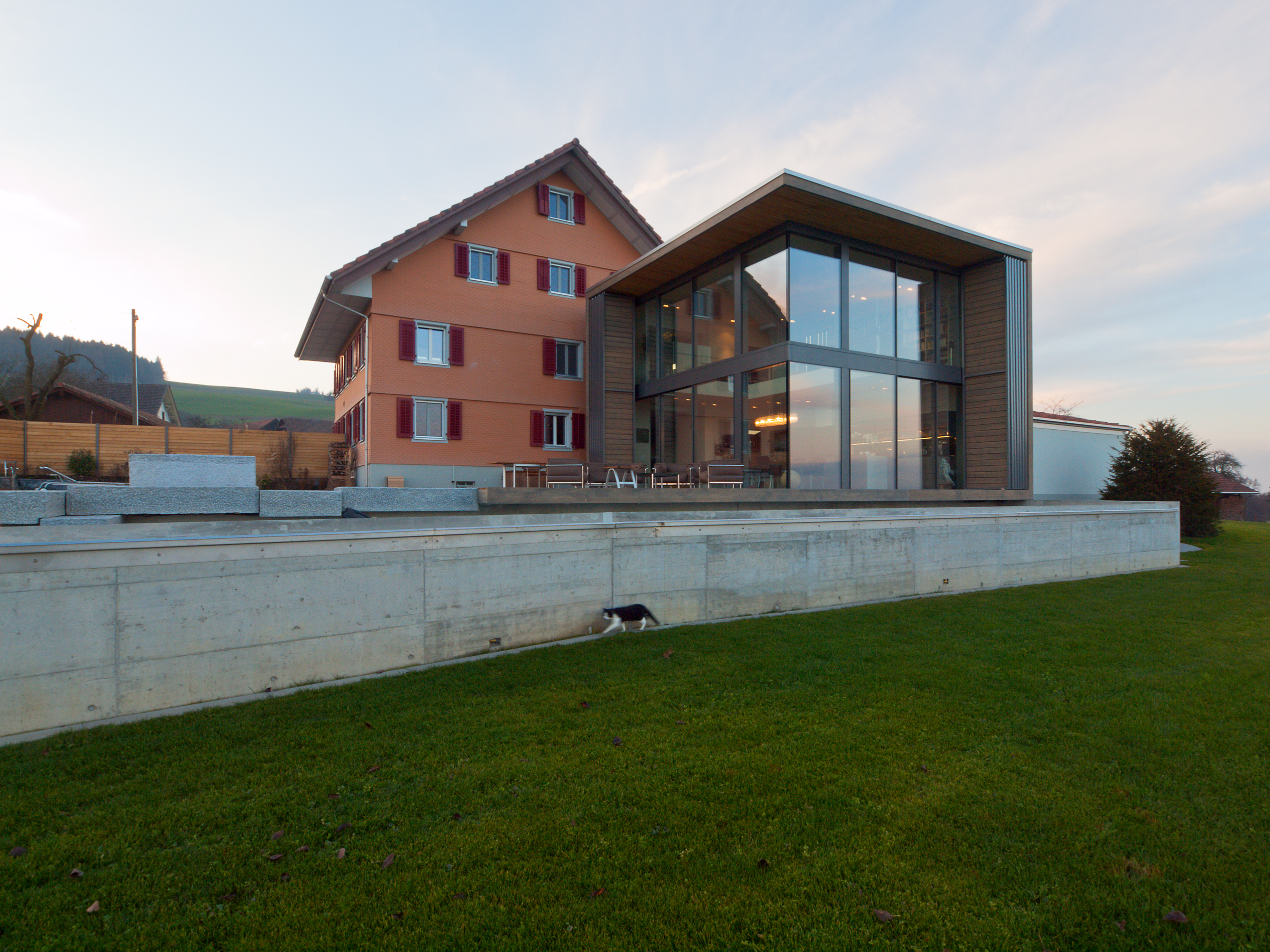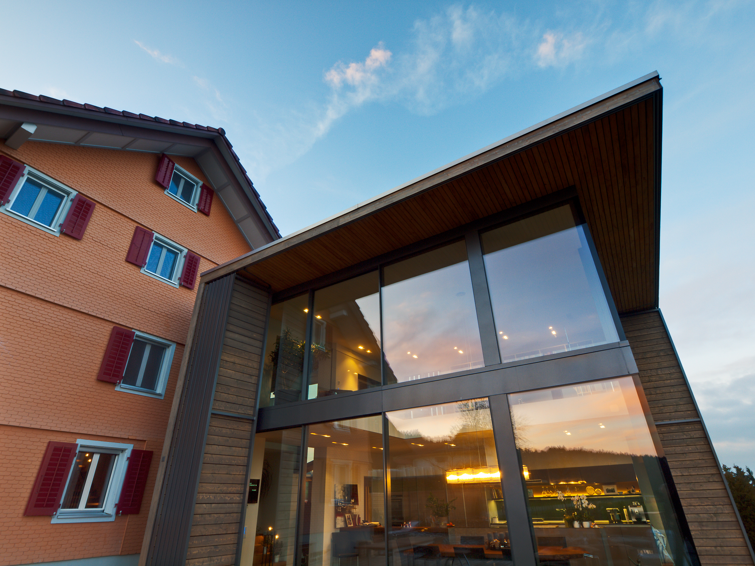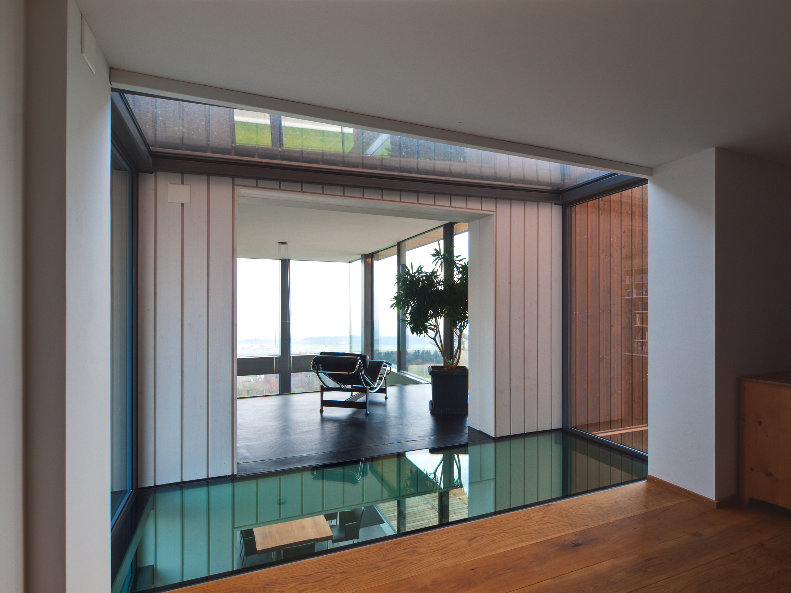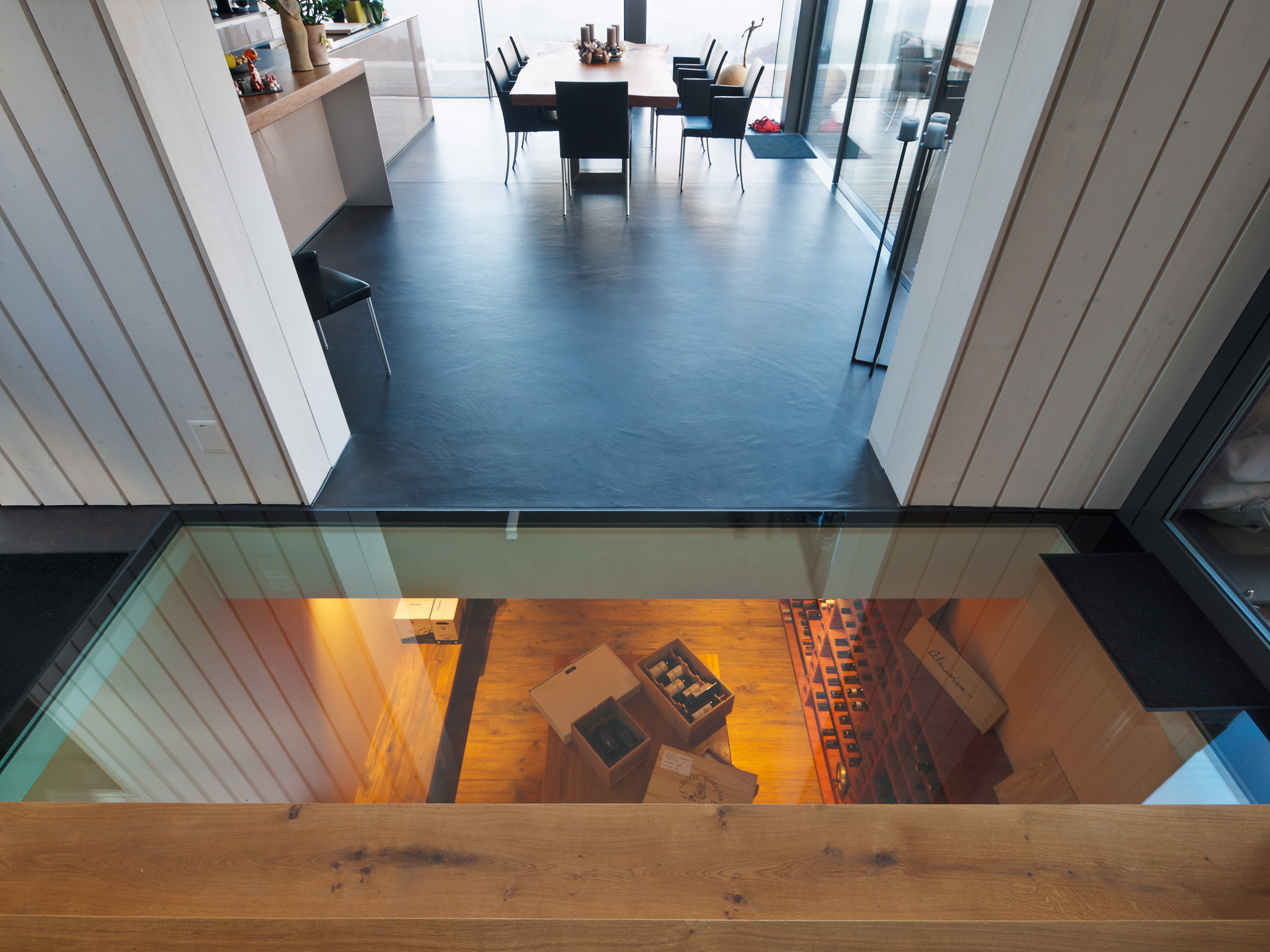 Für ein elegantes Einfamilienhaus hatten wir die Ehre, einen einzigartigen, vollständig verglasten Verbindungsbau zwischen Alt- und Neubau zu entwerfen. Besonders bemerkenswert war die Entscheidung, auch die beiden Etagenböden aus Glas zu gestalten, was einen faszinierenden Blick auf den Weinkeller ermöglicht und dem Raum eine aussergewöhnliche Transparenz verleiht. Die äusseren Schiebeläden, die eine beeindruckende Höhe von fast sechs Metern erreichen, können vollständig zur Seite geschoben oder nach Wunsch in jeder beliebigen Position fixiert werden.