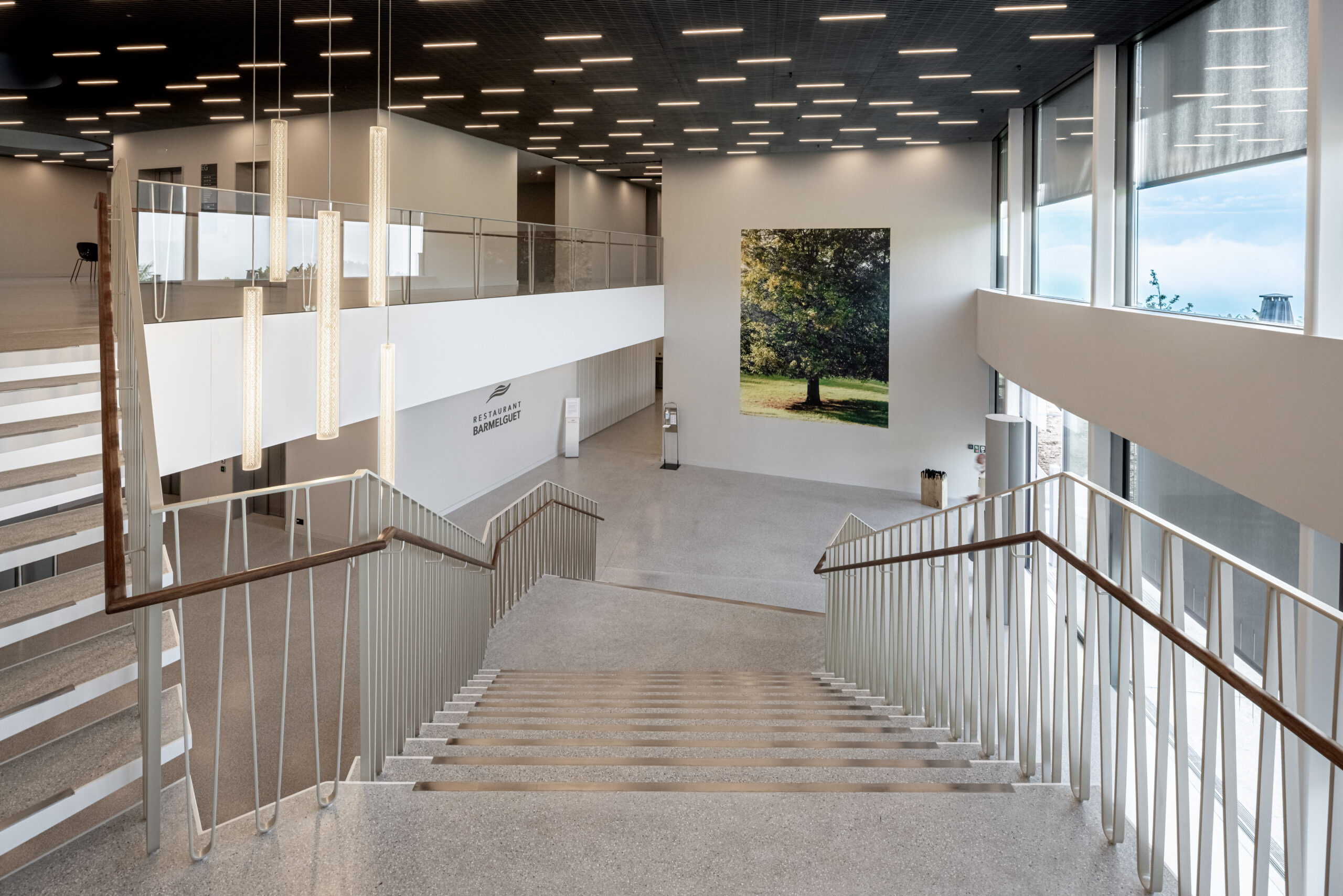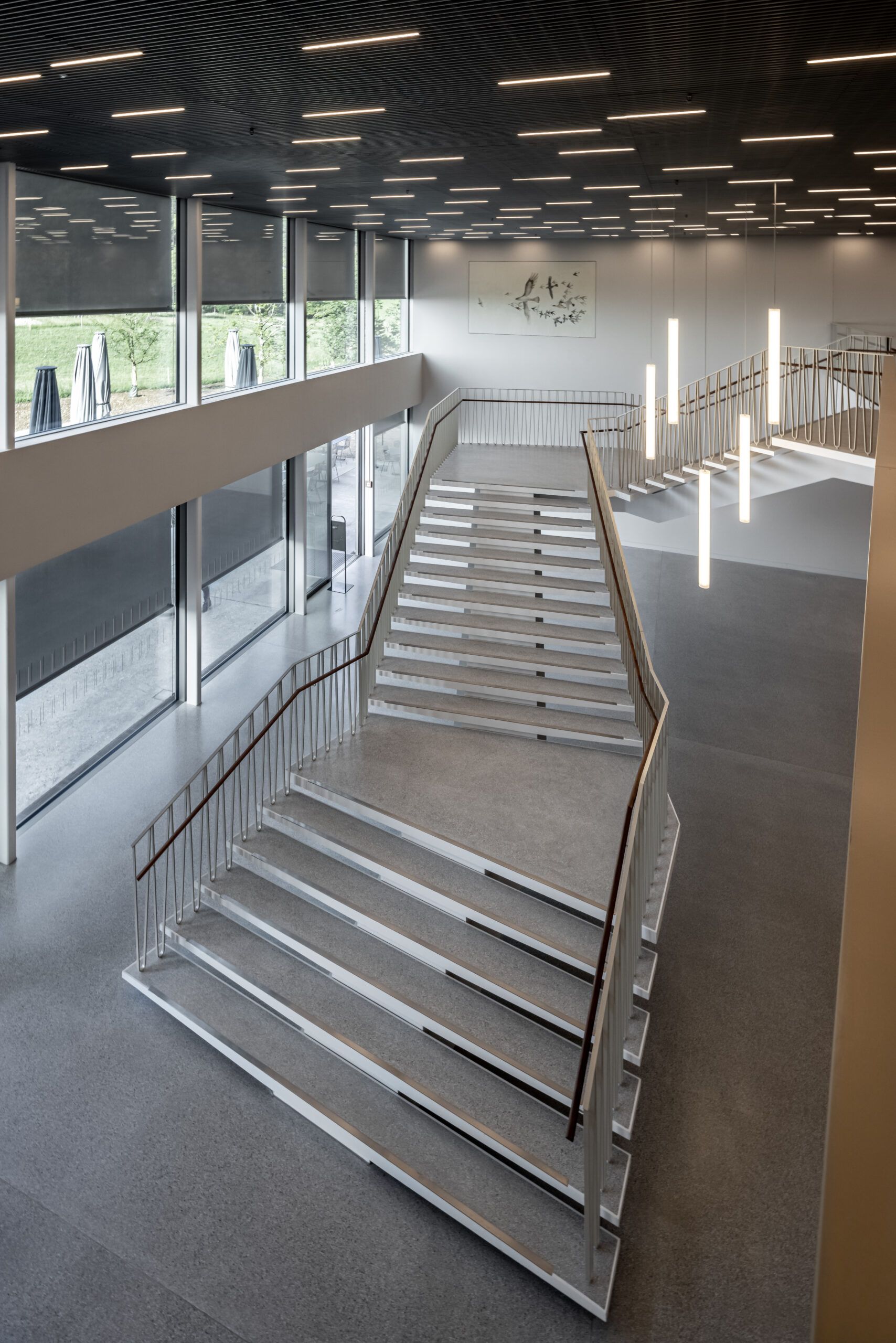 In der Eingangshalle der sanierten Klinik Barmelweid erhielten wir den Auftrag, eine markante Holmentreppe aus Stahl zu planen, die die Galerie mit dem Eingangsgeschoss verbindet. Eine besondere Herausforderung dieses Projekts war die anspruchsvolle Form der Treppe, die sich durch 22 individuelle gestaltete Stufen auszeichnet, die sich sowohl nach oben als auch nach unten zunehmend verbreitern.