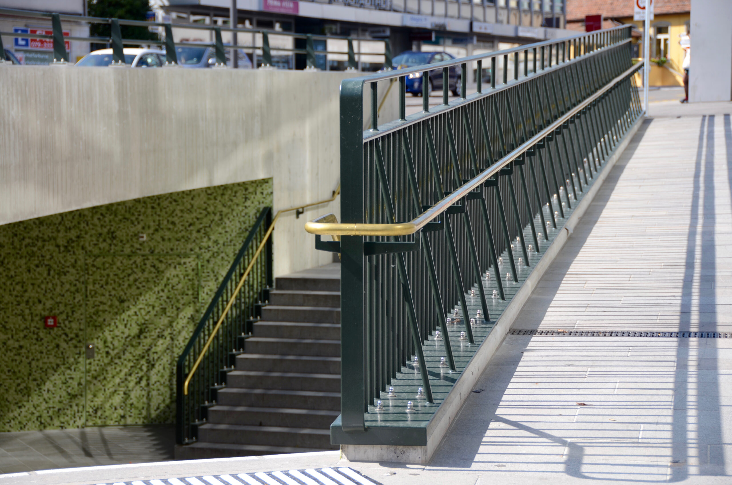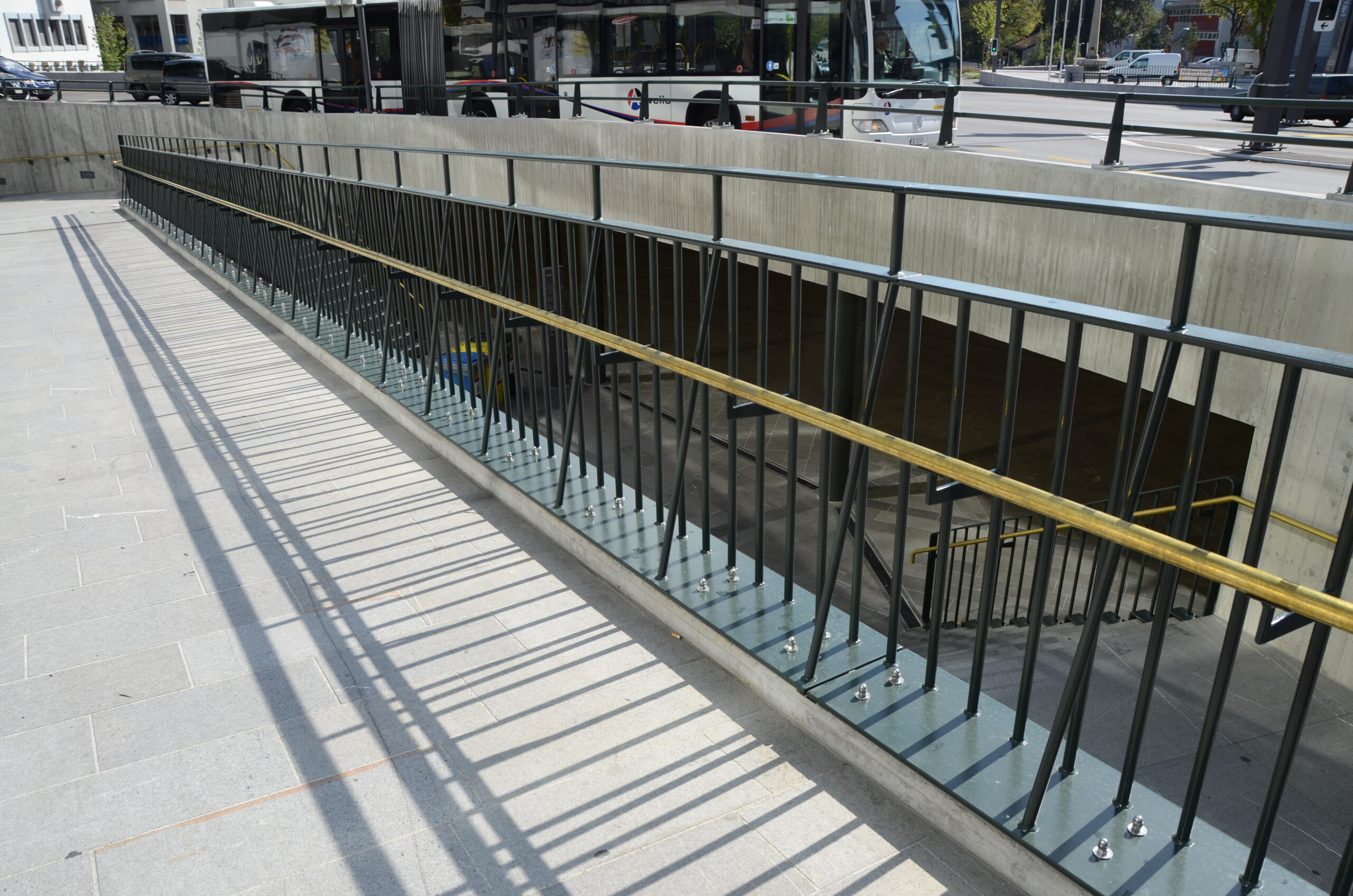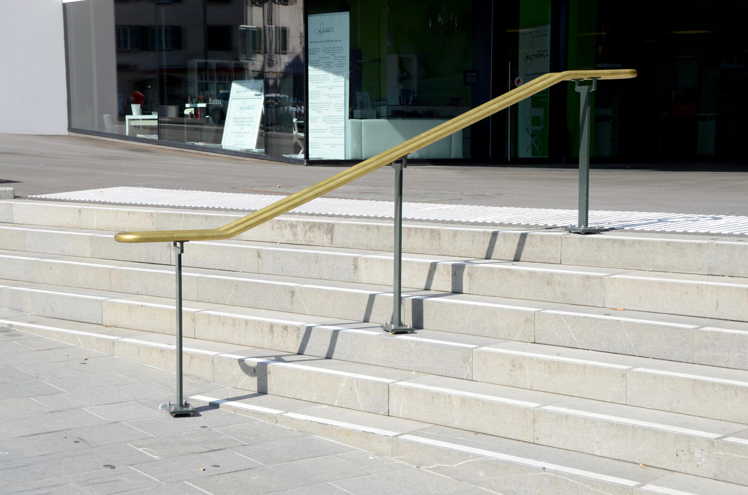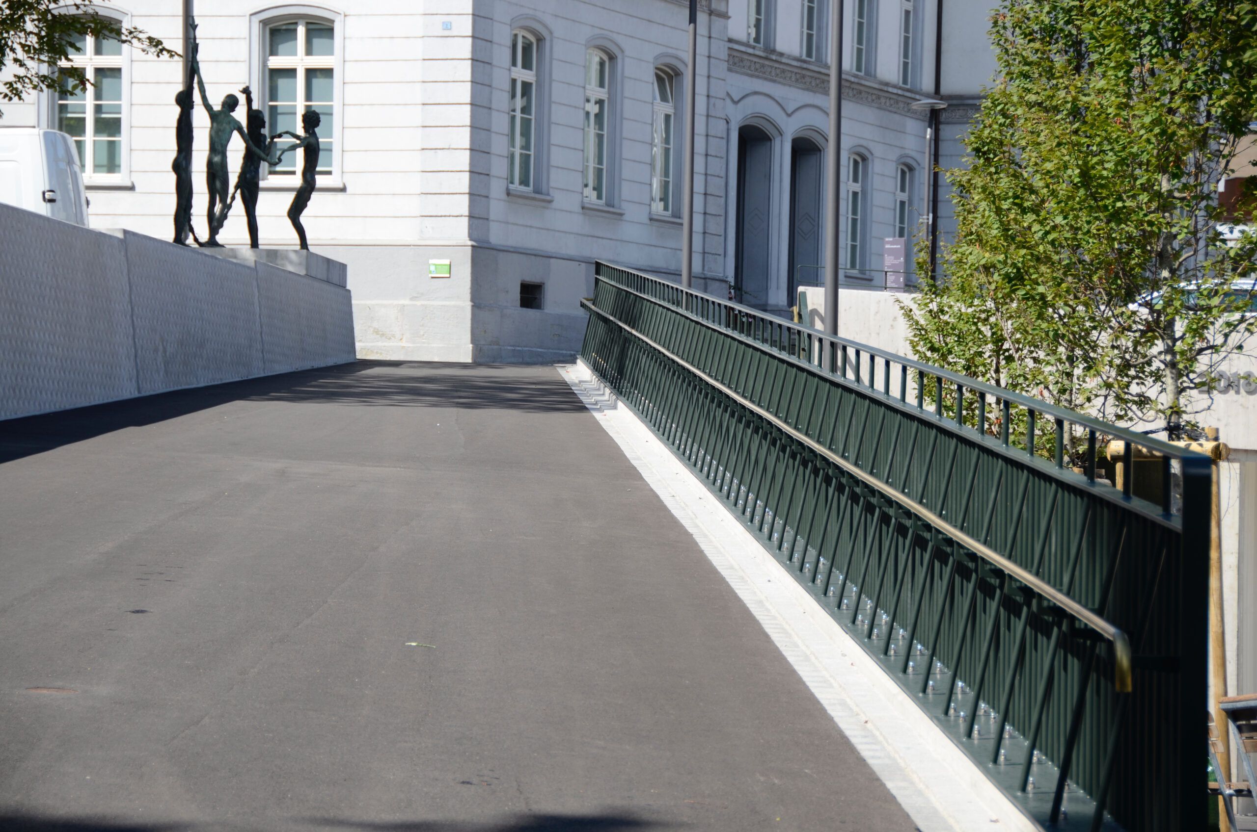 Bei der Neugestaltung des Schulhausplatzes in Baden erhielten wir den Auftrag, die Planung für sämtlicher Treppen-, Velorampen-Geländer sowie Handläufe zu übernehmen. Besonders herausfordernd war die Gestaltung der Treppengeländer, da der abgetreppte Untergurt eine sichere Verbindung mit den nach vorne geneigten Blockstufen gewährleisten musste. Die Velorampengeländer wurden mit einem zusätzlichen Obergurt ausgestattet, um die notwendige Absturzsicherheit für Velofahrer zu gewährleisten. Ein besonderer Blickfang ist der nach innen versetzte Messinghandlauf, der nicht nur funktional ist, sondern auch ästhetische Akzente setzt.