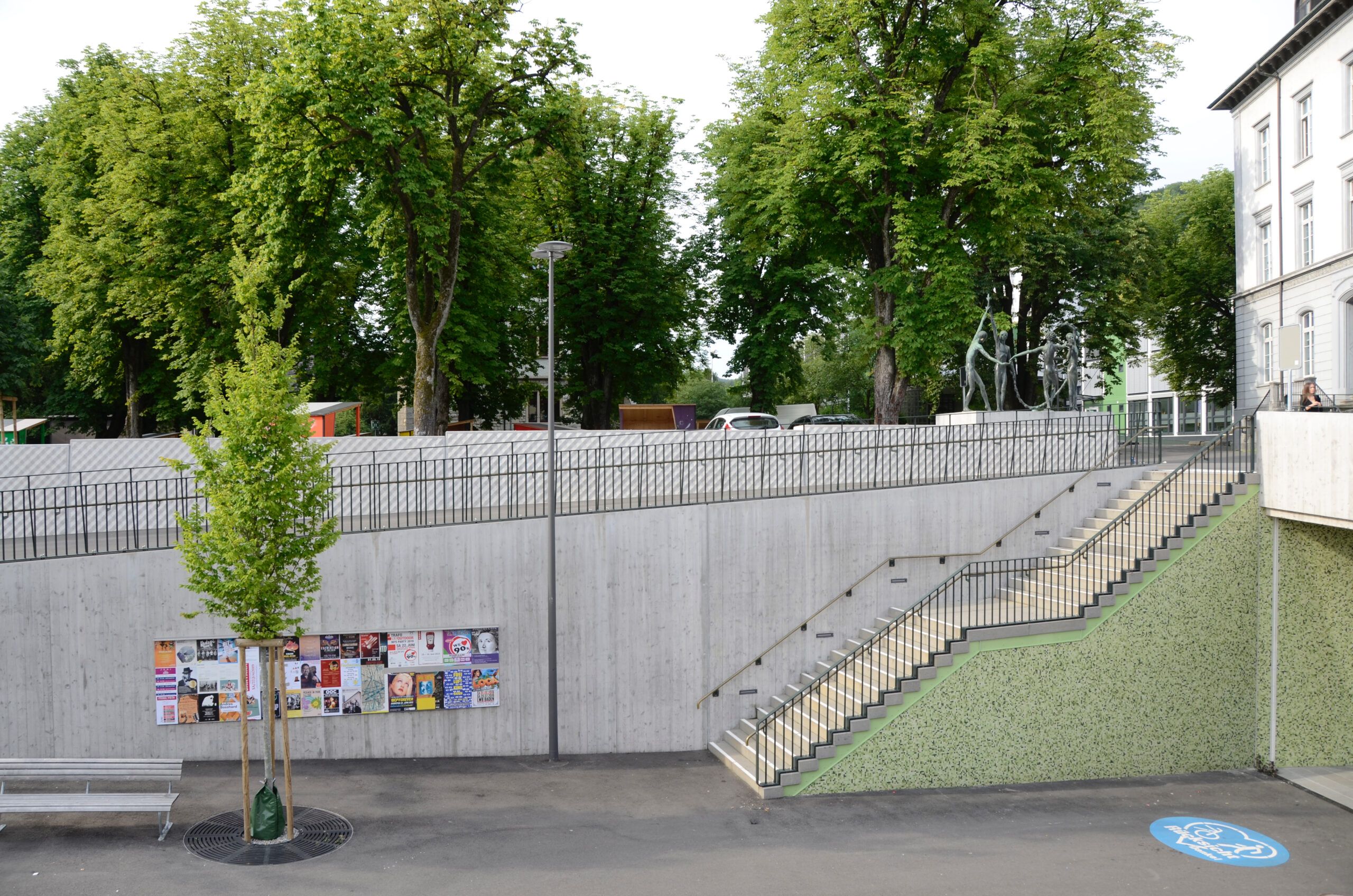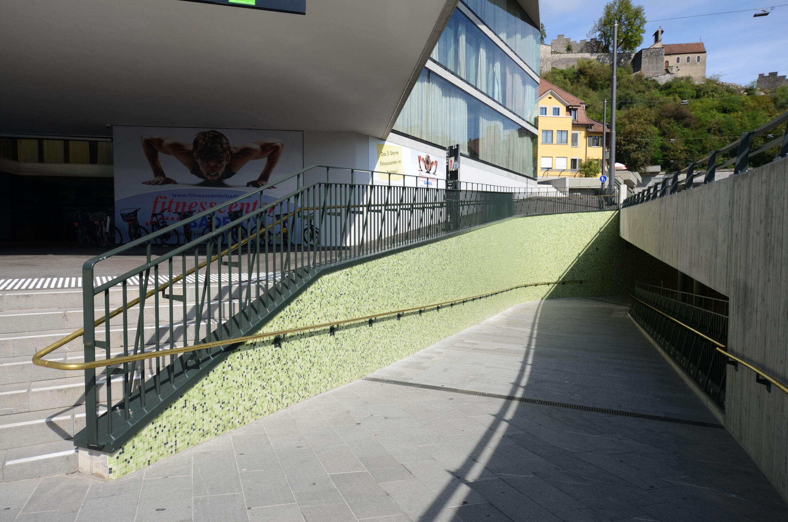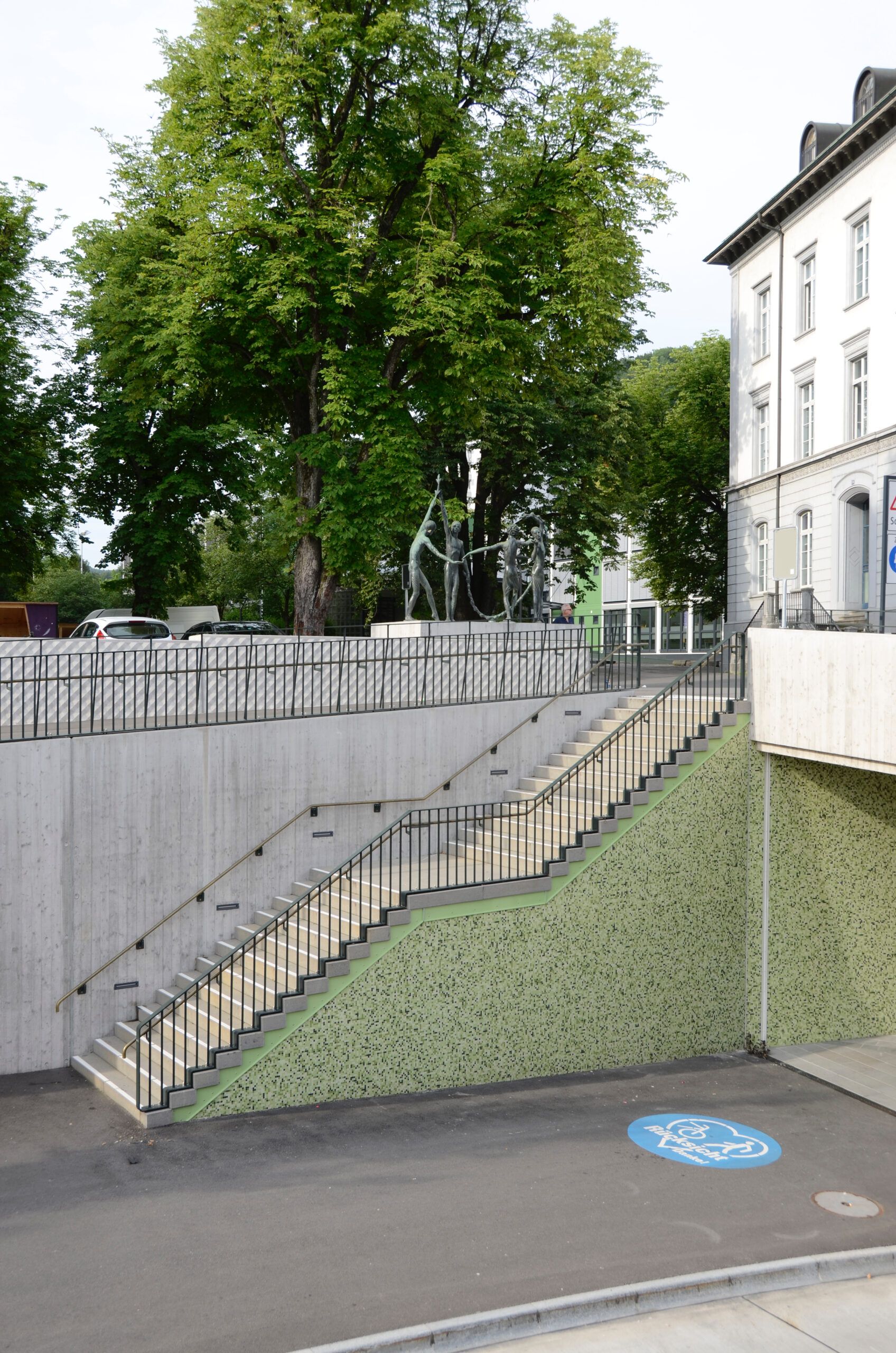 Bei der Neugestaltung des Schulhausplatzes in Baden erhielten wir den Auftrag, die Planung für sämtlicher Treppen-, Velorampen-Geländer sowie Handläufe zu übernehmen. Besonders herausfordernd war die Gestaltung der Treppengeländer, da der abgetreppte Untergurt eine sichere Verbindung mit den nach vorne geneigten Blockstufen gewährleisten musste. Die Velorampengeländer wurden mit einem zusätzlichen Obergurt ausgestattet, um die notwendige Absturzsicherheit für Velofahrer zu gewährleisten. Ein besonderer Blickfang ist der nach innen versetzte Messinghandlauf, der nicht nur funktional ist, sondern auch ästhetische Akzente setzt.