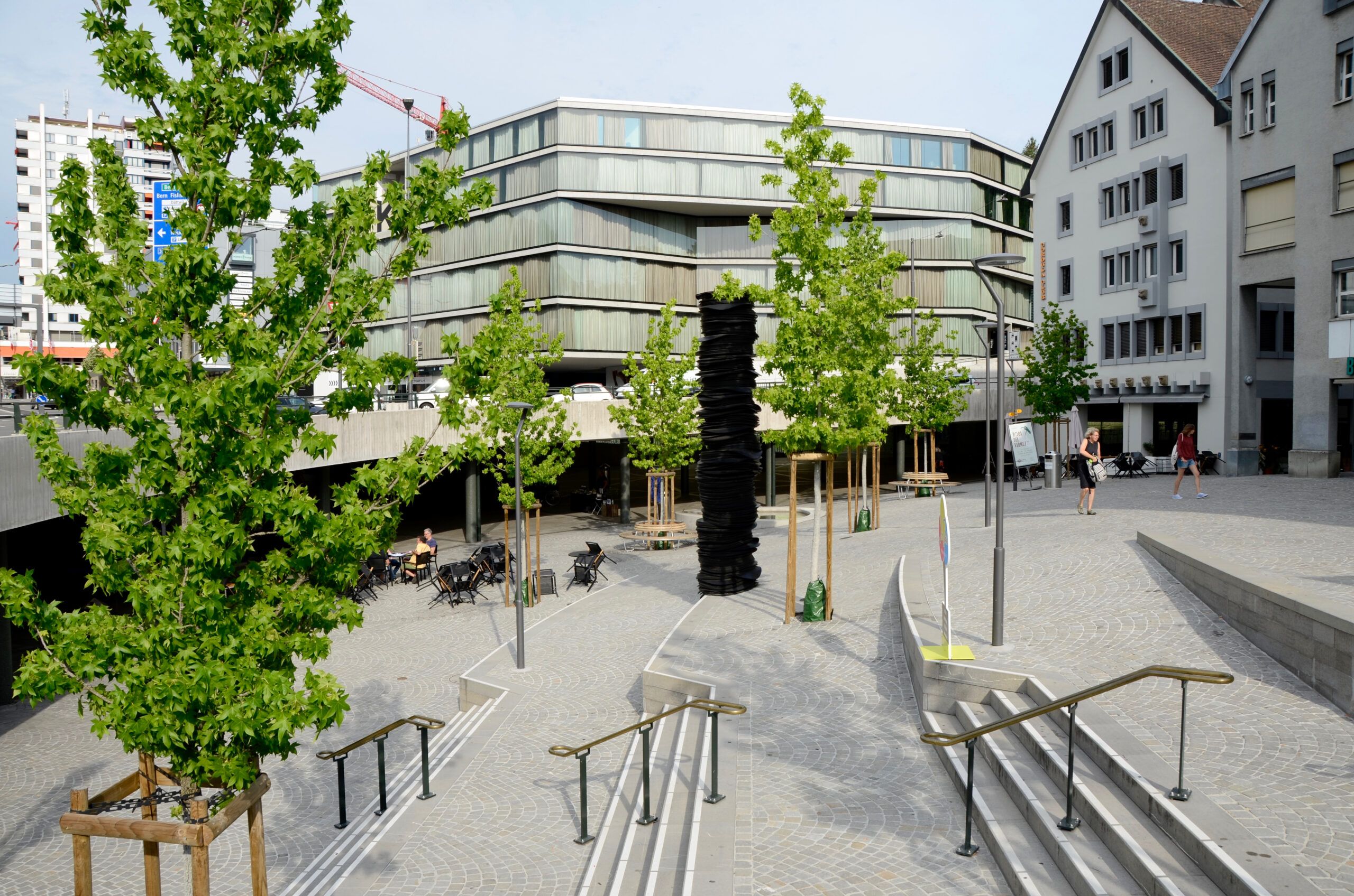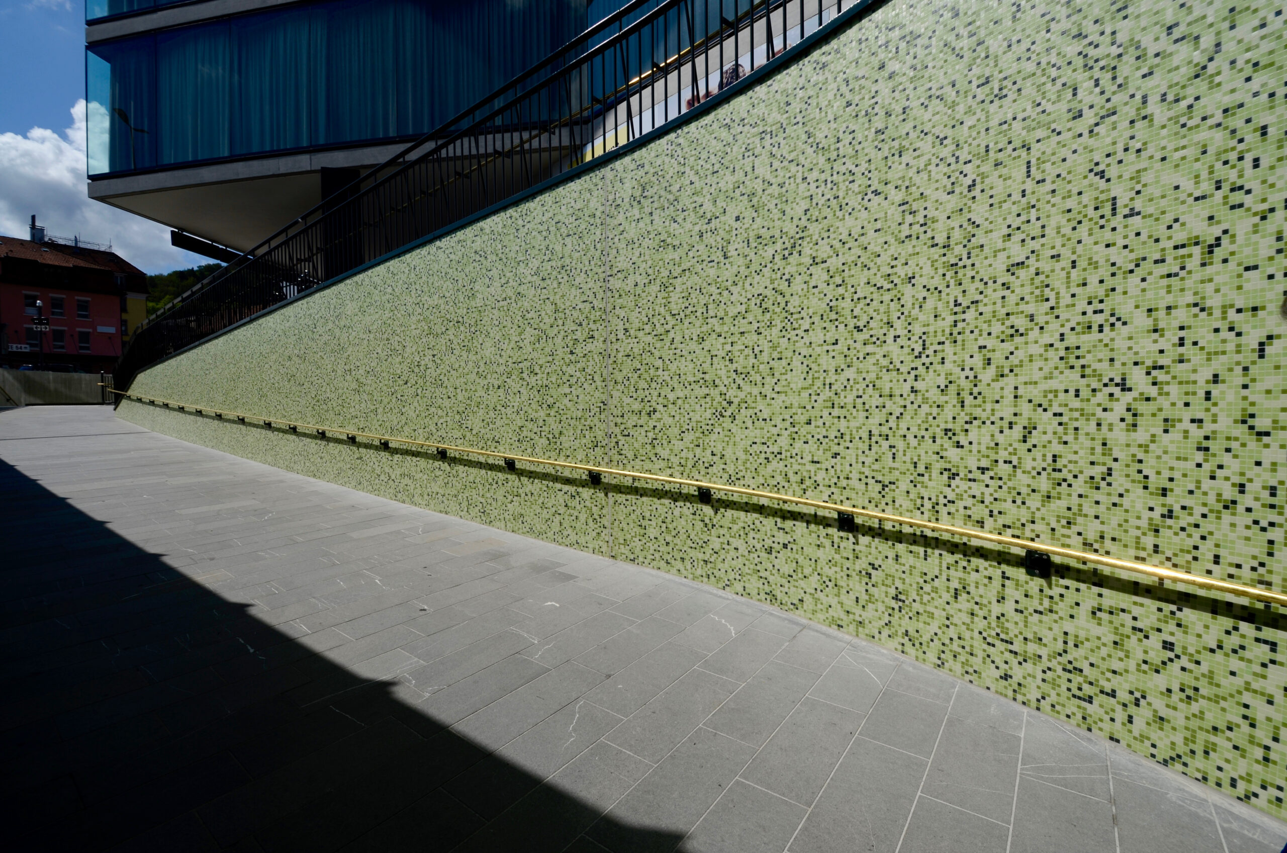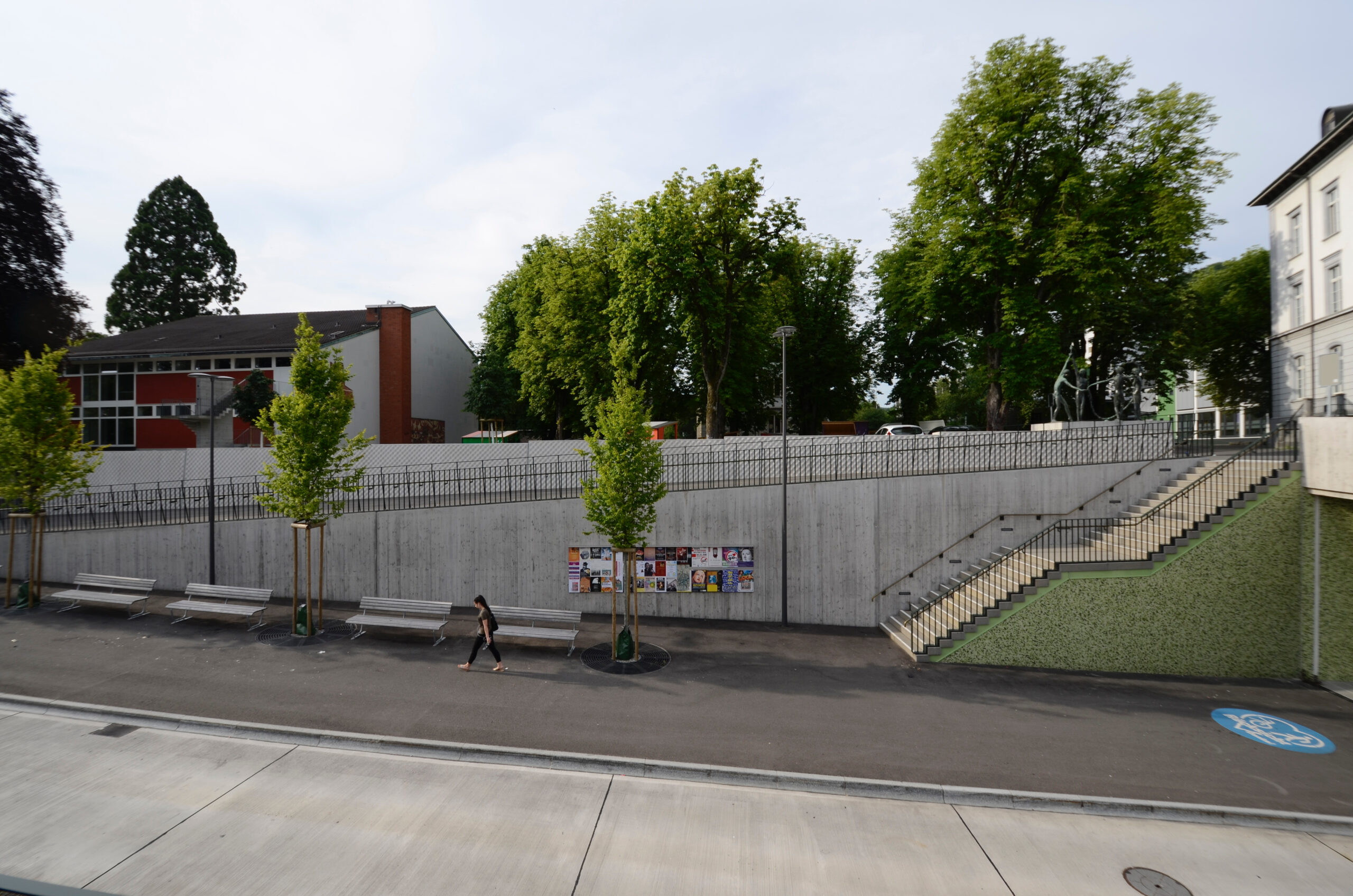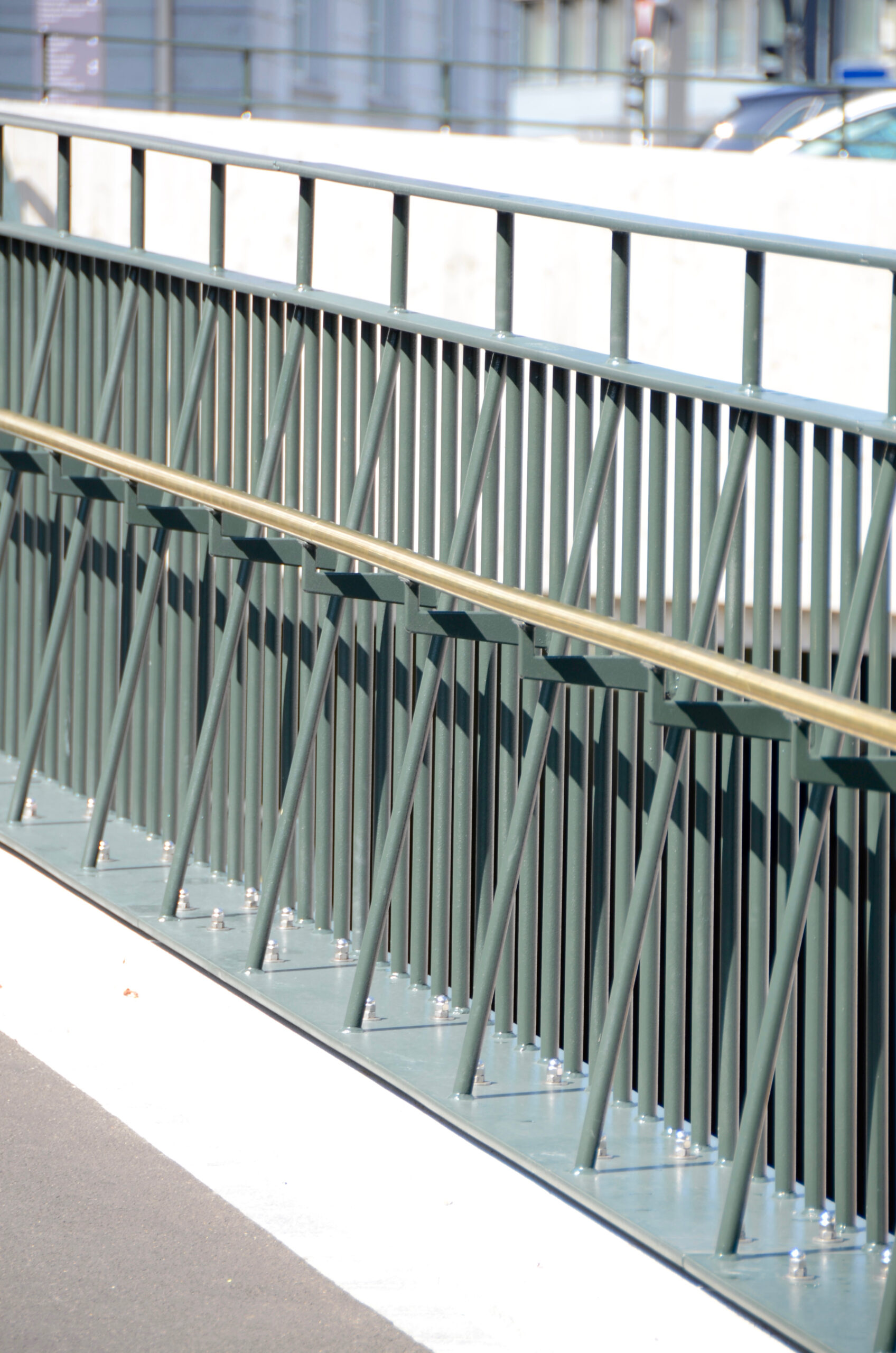 Bei der Neugestaltung des Schulhausplatzes in Baden erhielten wir den Auftrag, die Planung für sämtlicher Treppen-, Velorampen-Geländer sowie Handläufe zu übernehmen. Besonders herausfordernd war die Gestaltung der Treppengeländer, da der abgetreppte Untergurt eine sichere Verbindung mit den nach vorne geneigten Blockstufen gewährleisten musste. Die Velorampengeländer wurden mit einem zusätzlichen Obergurt ausgestattet, um die notwendige Absturzsicherheit für Velofahrer zu gewährleisten. Ein besonderer Blickfang ist der nach innen versetzte Messinghandlauf, der nicht nur funktional ist, sondern auch ästhetische Akzente setzt.