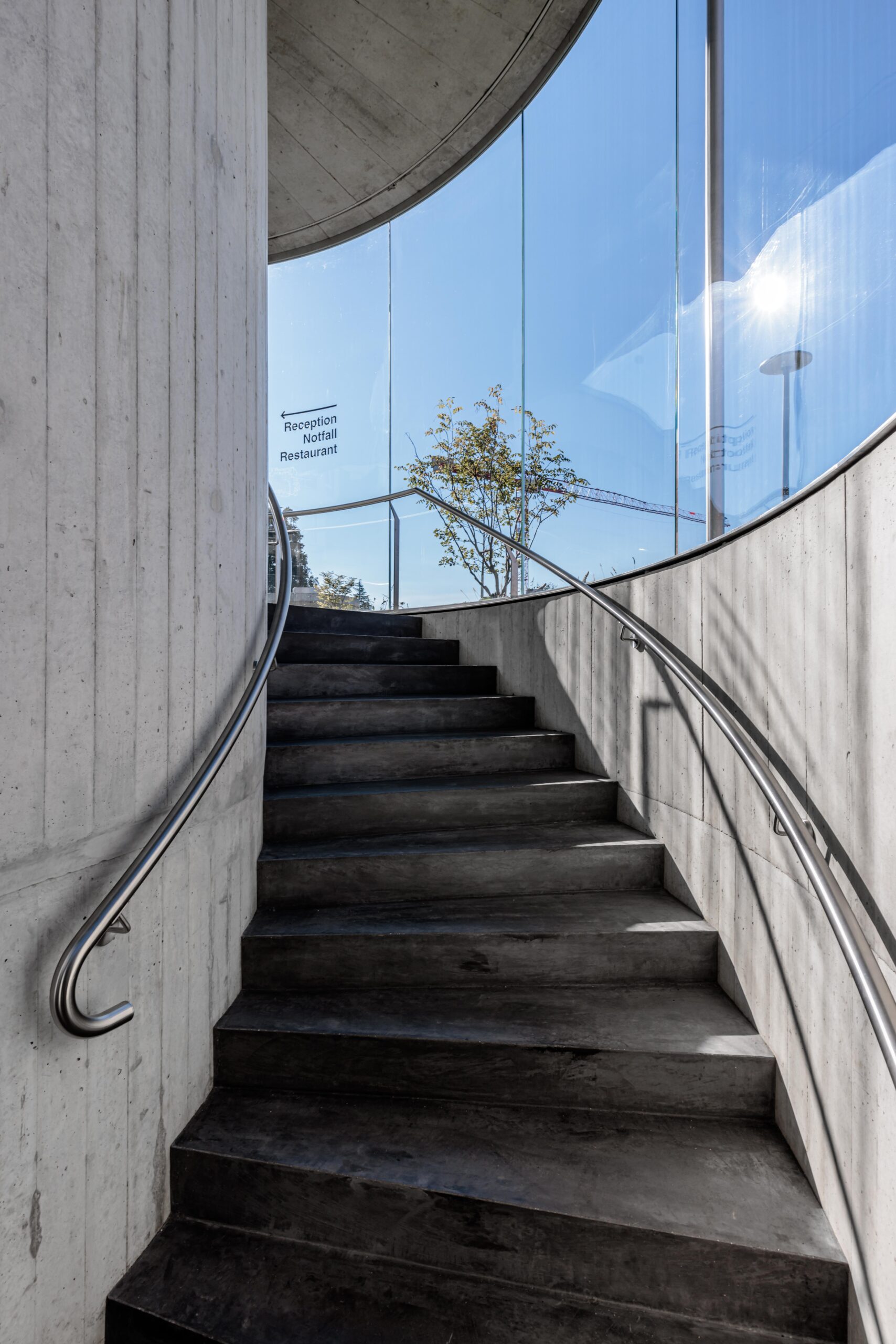 Im Rahmen der Erweiterung des Spitals und der Reha Uster wurden wir mit der Planung einer eleganten, in Chromstahl gebogenen Lift- und Treppenhausverglasung beauftrag. Die Glasfassade bietet nicht nur eine aussergewöhnliche Ästhetik, sondern auch einen offenen Blick auf die Umgebung. Der Handlauf, ebenfalls aus Chromstahl, folgt der sanften Kurve der Struktur und sorgt für zusätzliche Sicherheit und Komfort. Diese architektonische Lösung fügt sich harmonisch in das moderne Design des Gebäudes ein und fördert gleichzeitig den barrierefreien Zugang.