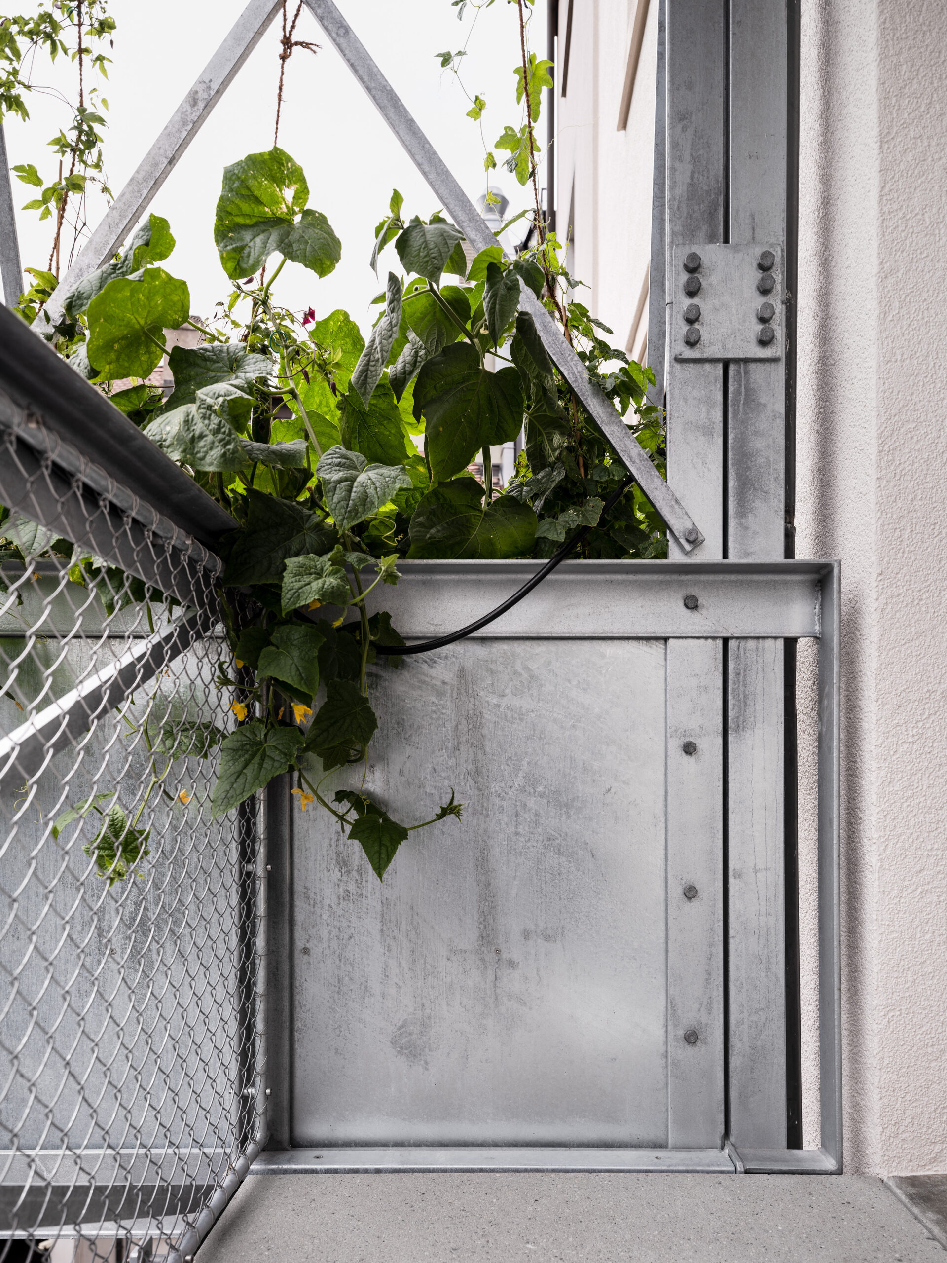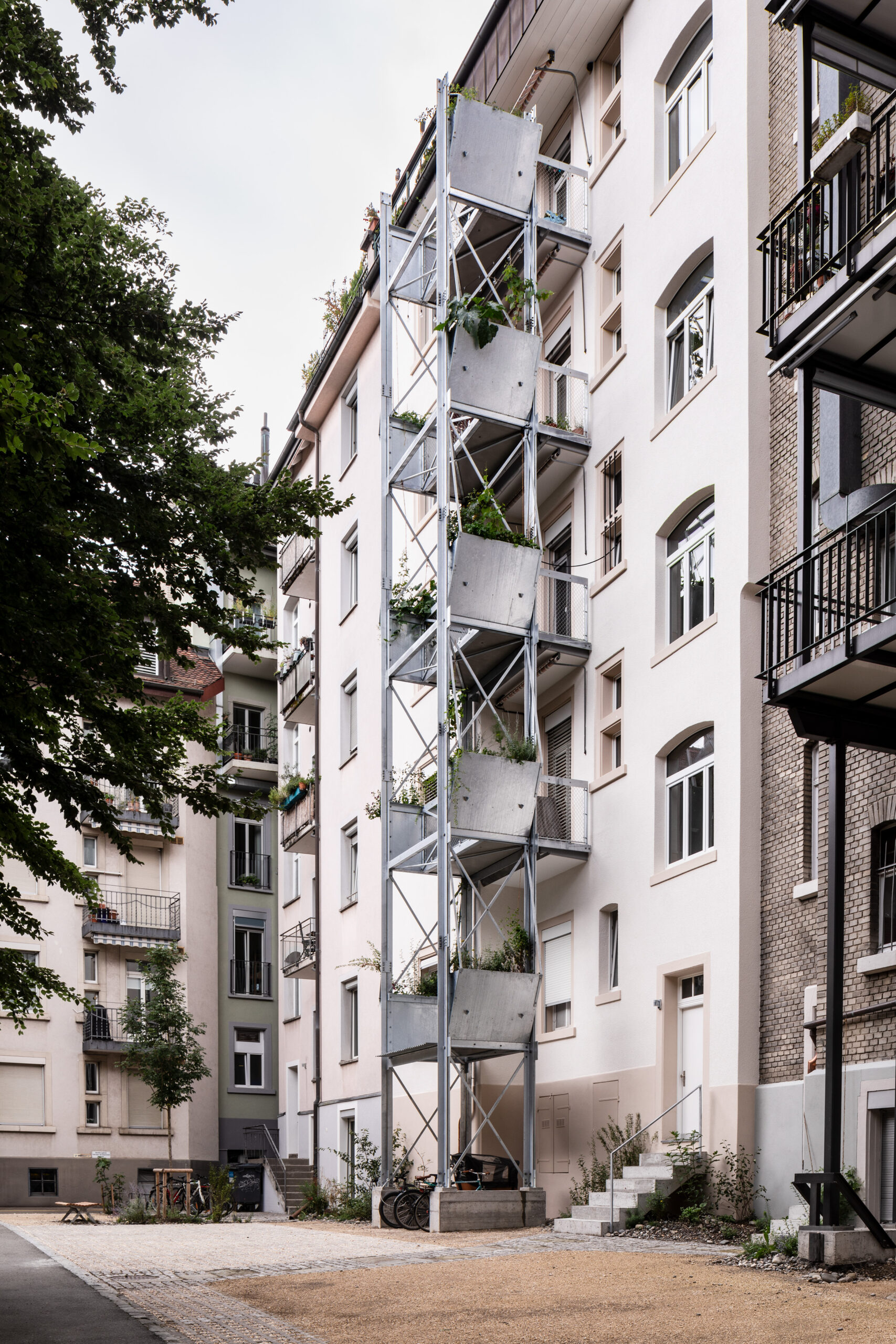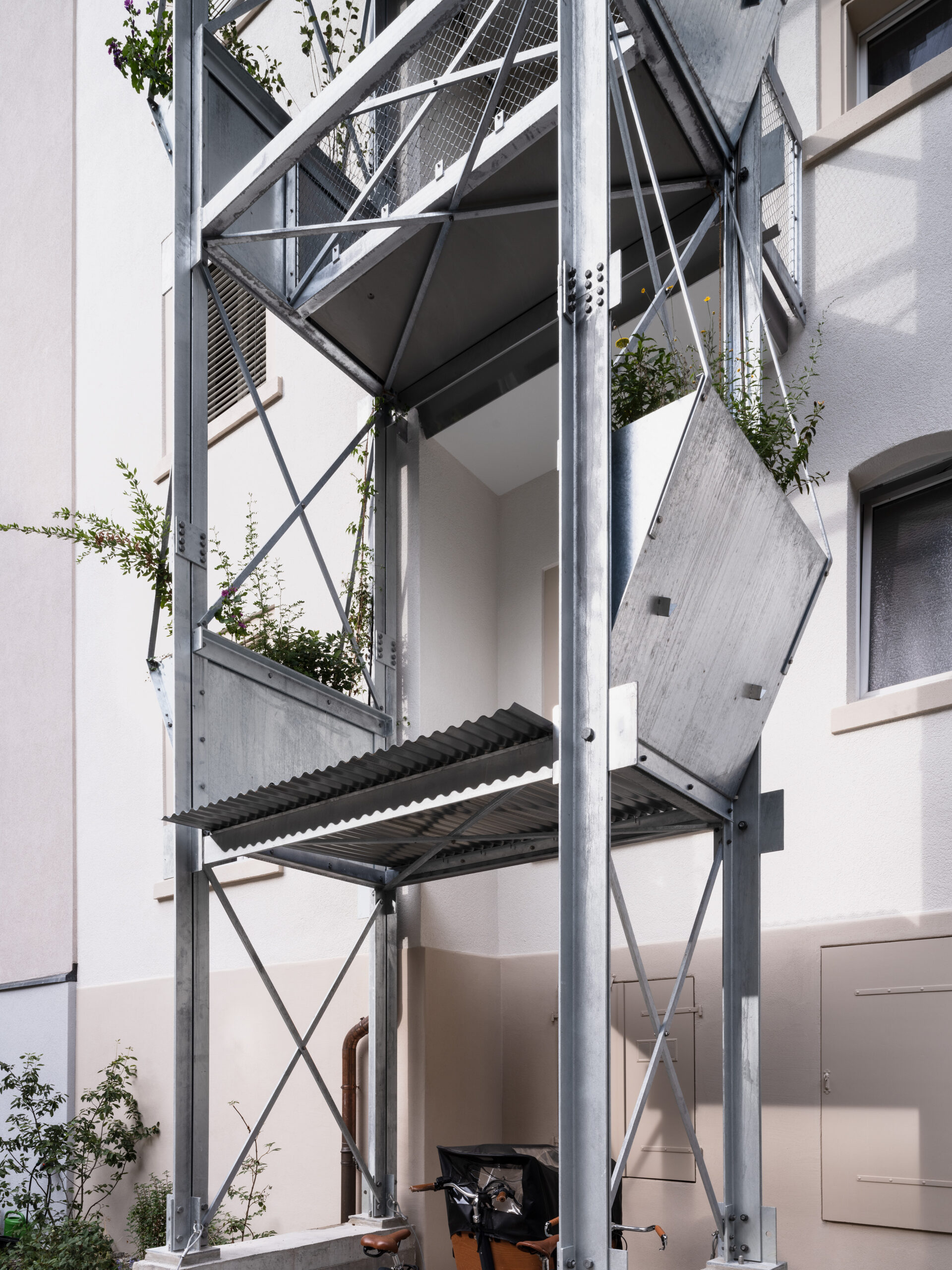 An der Stampfenbachstrasse 159 im Zürcher Stadtkreis 6 wurden wir mit der Planung einer innovativen Balkonerweiterung beauftragt, bei der teilweise wiederverwendete Stahlteile zum Einsatz kamen. Die zehn Pflanztröge, die insgesamt 3m³ Erdvolumen beherbergen, schaffen vertikale grüne Oasen. Eine besondere Herausforderung bestand darin, die Stahlkonstruktion vollständig verschraubt auszuführen, abgesehen von den Balkonböden, auf denen eine Betonplatte als Belag verlegt wurde. Die einzelnen Etagen der Konstruktion wurden im Werk vormontiert und später auf der Baustelle zu einer harmonischen Einheit zusammengesetzt.